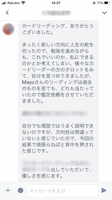 まったく新しい方向に人生の舵を切ったので、勉強を進めながらも、これでいいのか、私にできるのかとか考えてしまい、様々なカードリーダーの方のタロットをみて、自分を見つめてきましたが、Mayoさんのリーディングは過去のものを見ても、どれも当たっていたので鑑定依頼をさせていただきました。