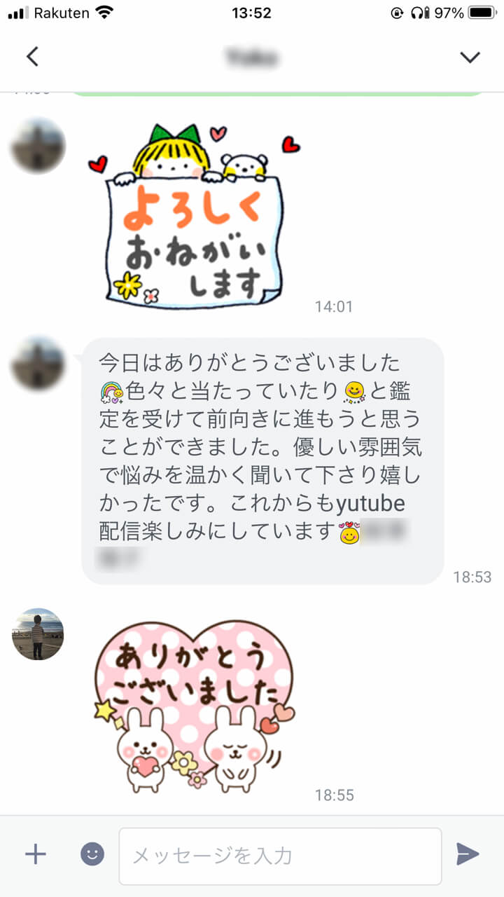 今日はありがとうございました(emoji)色々と当たっていたり(emoji)と鑑定を受けて前向きに進もうと思うことができました。優しい雰囲気で悩みを温かく聞いて下さり嬉しかったです。これからもyutube配信楽しみにしています(emoji)