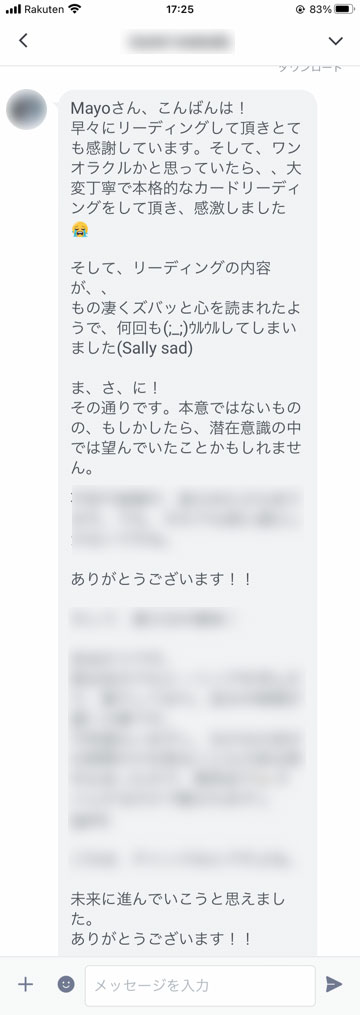 早々にリーディングして頂きとても感謝しています。そして、ワンオラクルかと思っていたら、、大変丁寧で本格的なカードリーディングをして頂き、感激しました😭